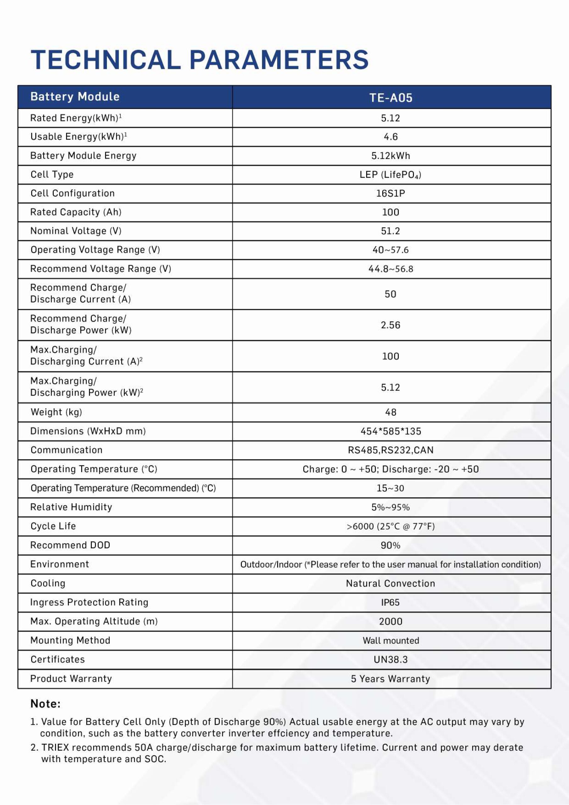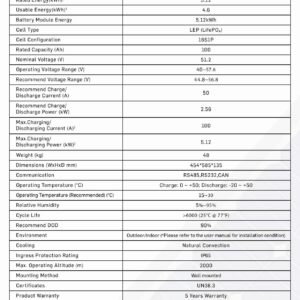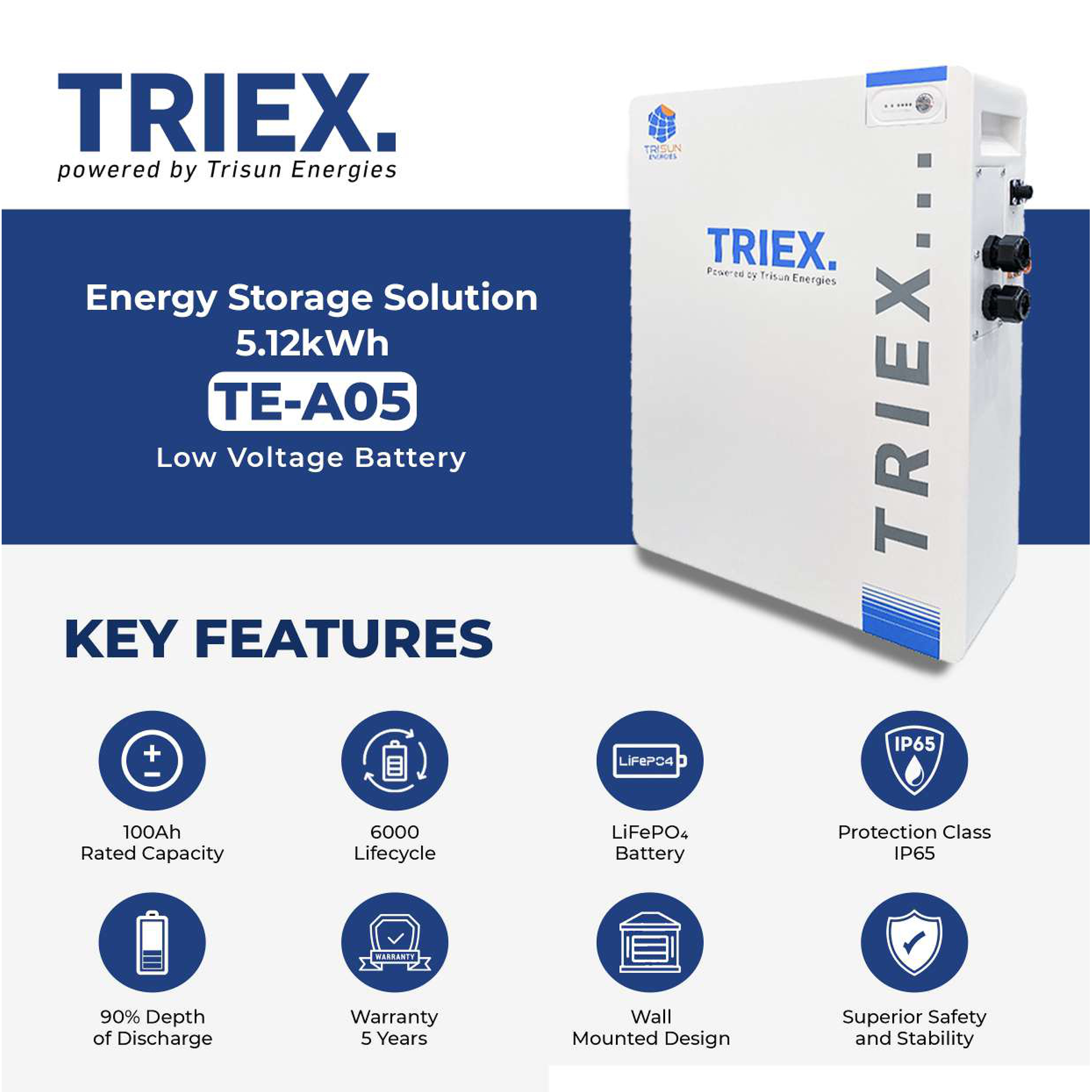 The TRIEX TE–A0548V 100A Lithium Battery offers 5.12kWh storage, 90% depth of discharge, and long-lasting LiFePO₄ technology. With IP65 protection, wall-mounted design, and multi-protocol communication, it’s a durable and efficient energy solution backed by a 5-year warranty.